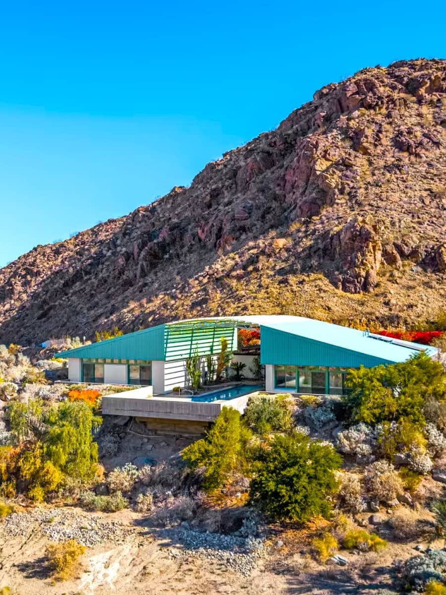 Le linee nette e pulite di un classico tetto moderno di metà secolo si stagliano perfettamente contro le aspre montagne di San Jacinto, tinte di viola al tramonto, viste dal patio privato di uno dei migliori hotel di Palm Springs o da un’elegante casa vacanze come Terra Palm Springs.